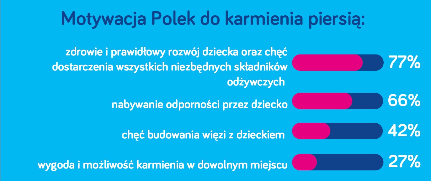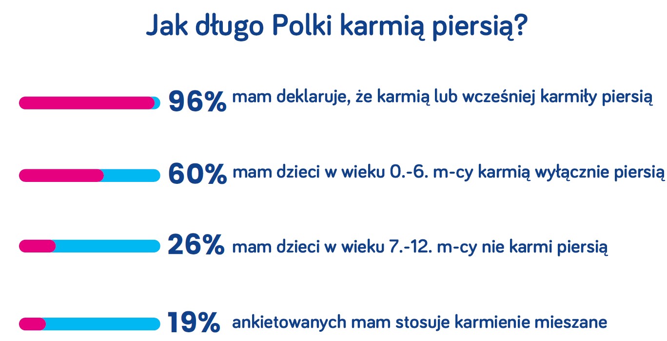 Zdecydowana większość Polek decyduje się na karmienie piersią ze względu na troskę o zdrowie i prawidłowy rozwój maluszka ? kobiety wiedzą, że w swoim mleku przekazują niezbędne składniki odżywcze kluczowe w procesie nabywania odporności dziecka. Wymieniają także chęć budowania więzi z niemowlęciem oraz zwracają uwagę na fakt, że karmienie piersią jest po prostu wygodne. 60% mam dzieci w wieku 0-6 miesięcy karmi wyłącznie piersią, a 74% kontynuuje karmienie piersią dzieci w przedziale wiekowym od 7. do 12. miesięcy.