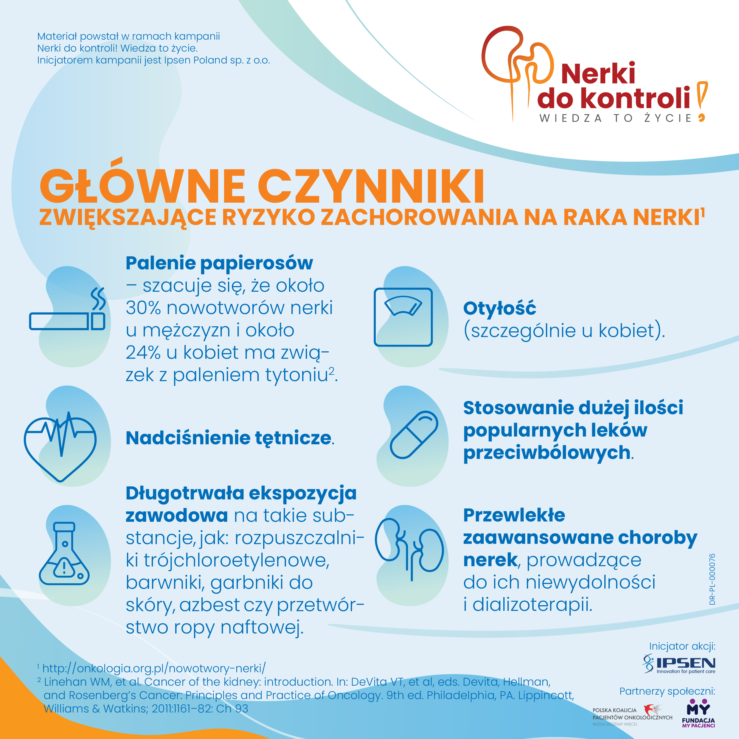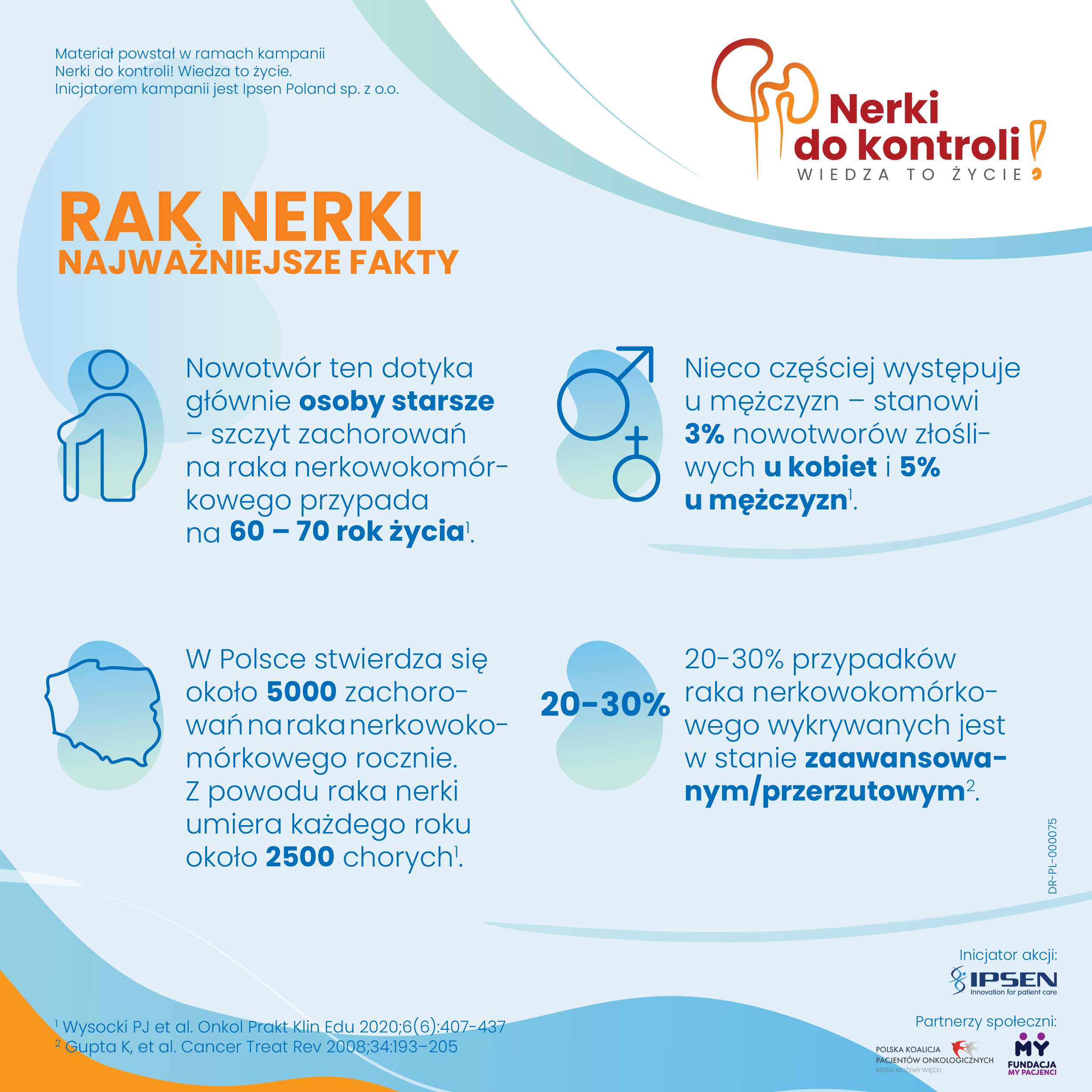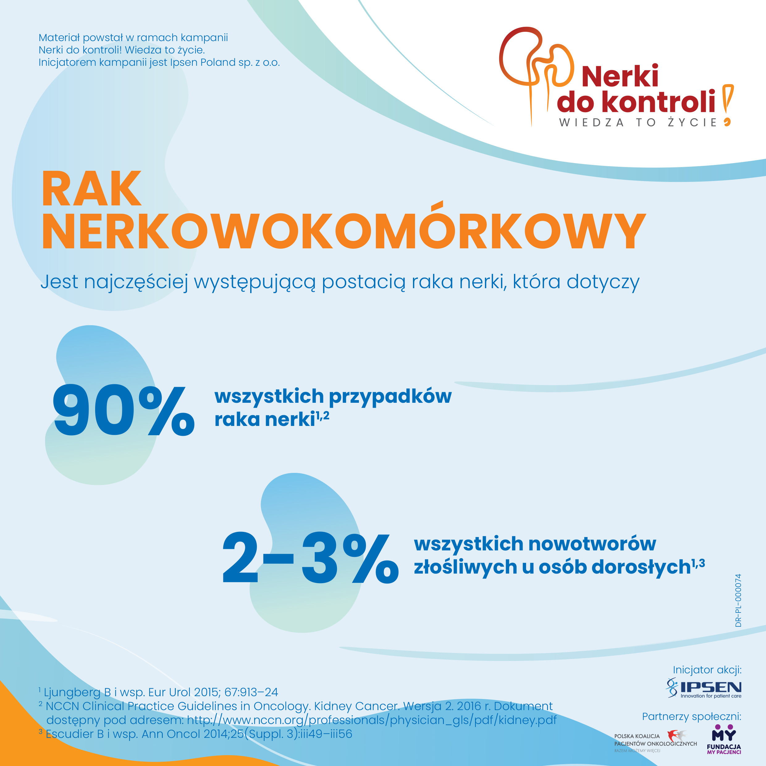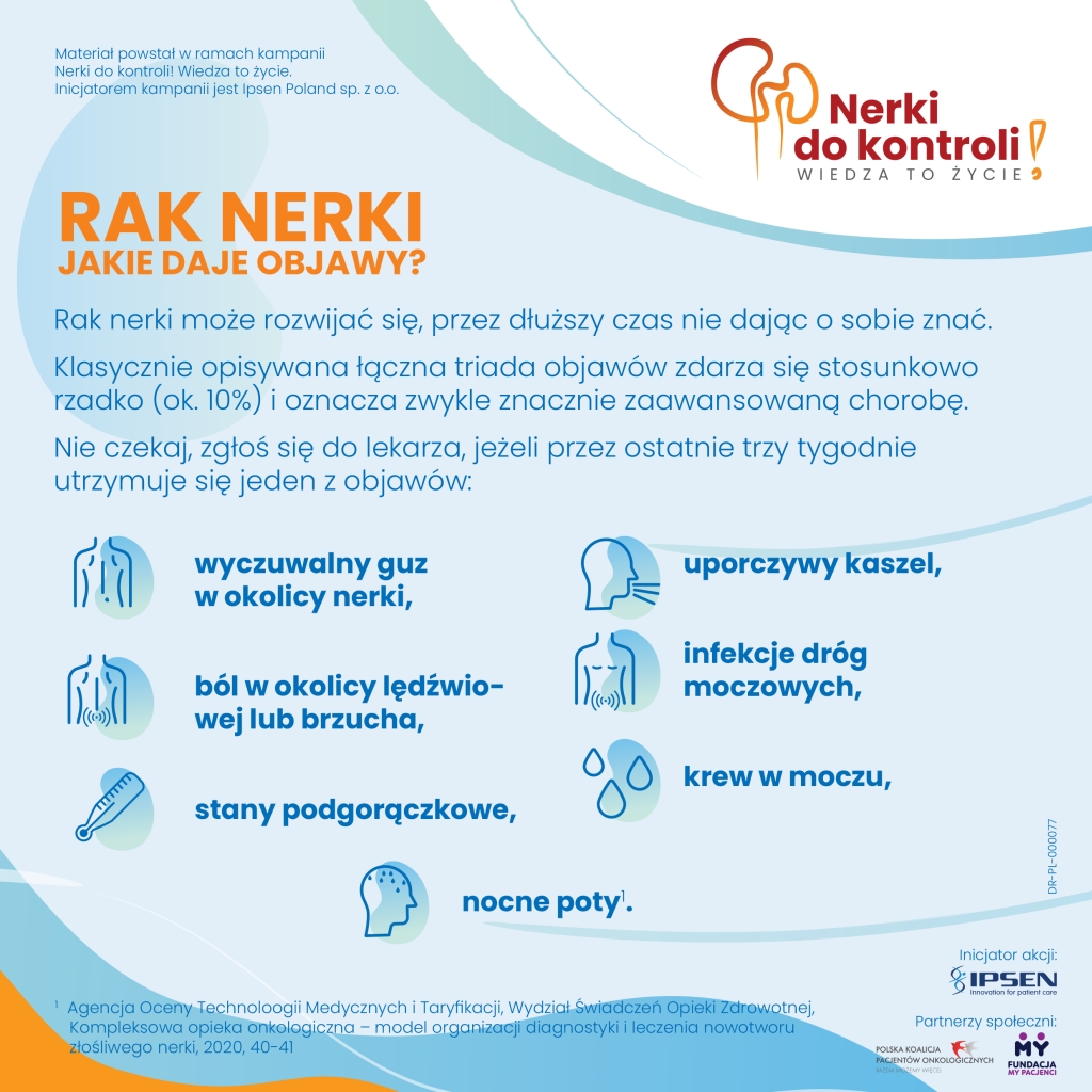 Nerki do kontroli! Wiedza to życie to kampania edukacyjna nt. raka nerki. Celem inicjatywy jest zwiększanie świadomości nt. raka nerkowokomórkowego, stanowiącego ponad 90% wszystkich zachorowań na raka nerki5, upowszechnianie wiedzy nt. objawów choroby oraz zwrócenie uwagi na rolę badań umożliwiających wykrycie choroby na wczesnym etapie. Inicjatorem akcji jest Ipsen Poland Sp. z o.o. Partnerami społecznymi inicjatywy